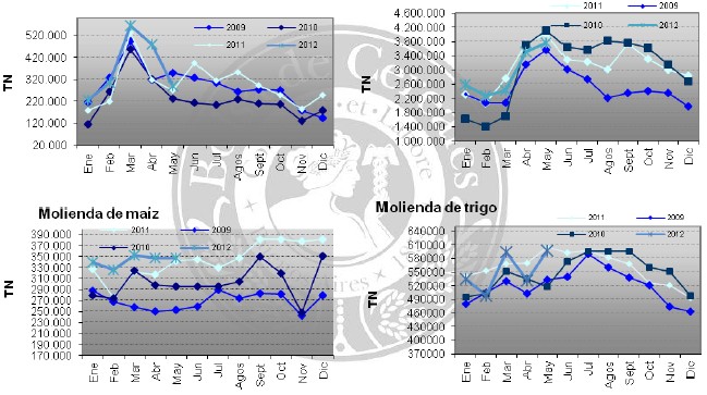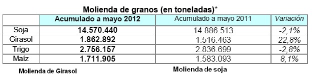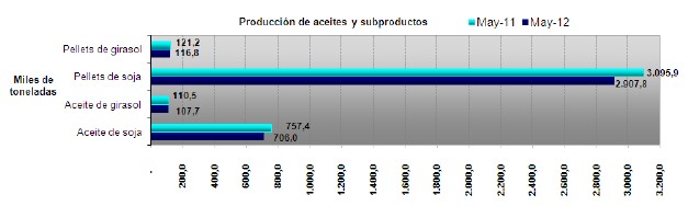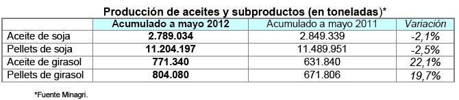 La producción de Aceites y subproductos, en mayo de 2012 presentó las siguientes variaciones con respecto al mismo período del año anterior: para los subproductos de la soja (aceites -2,1%, pellets -2,5) y los de girasol (aceites 22,1%, pellets 19,7%).