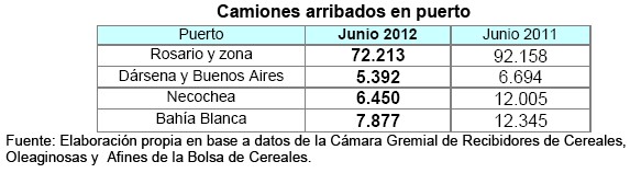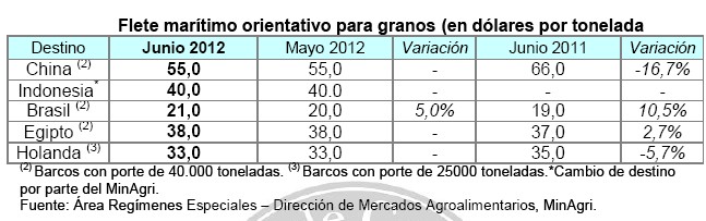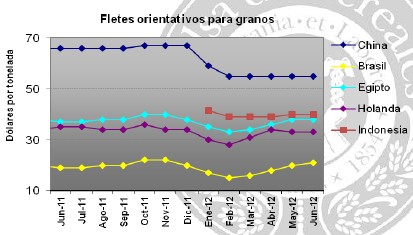 Respecto al mismo mes del año pasado la variación fue de -22%. En cuanto a los fletes marítimos orientativos para granos en junio de 2012, solo el destino Brasil registró una diferencia con respecto al mes anterior, que fue del 5,0%.