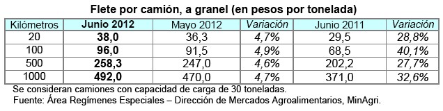 Los fletes por Camión en junio de 2012, presentaron las siguientes variaciones con respecto al mismo mes del año anterior: 20 km +28,8%, 100 km +40,1%, 500 km +27,7%, 1000 km +32,6%.