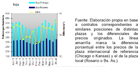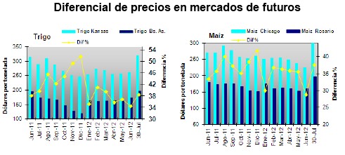 Los diferenciales de precios entre similares posiciones de distintas plazas de los Mercados de Futuros son los siguientes para el mes de junio: para el trigo (34,4%), para la soja (36,3%) y para el maíz (28,9%).