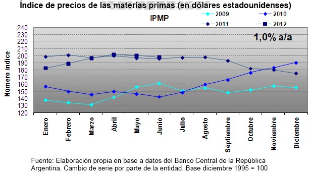 El Índice de Precios de Materias Primas de junio se ubicó en un valor de 198,5. En términos interanuales la variación es de 1,0%, e intermensualmente se observa una baja del 1,3.