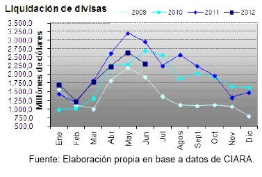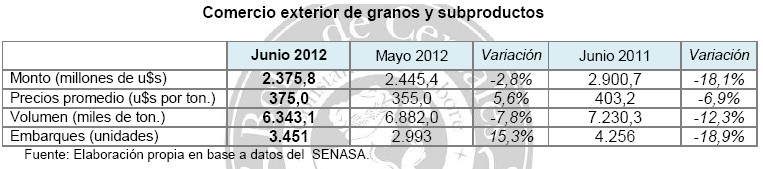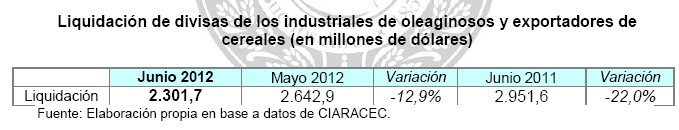 Las ventas externas de granos y subproductos en junio presentaron las siguientes variaciones con respecto al mes anterior: -2,8% para los montos, 5,6% para los precios, -7,8% para los volúmenes y 15,3% para los embarques. La liquidación de divisas presentó en junio una variación de -12,9% con respecto al mes anterior.
