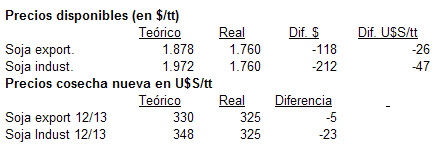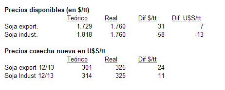 En lo que hace a soja de la campaña nueva, se está pagando un precio relativamente similar al de la exportación, pero 23 U$S/tt menor al que podría pagar la industria. No obstante esto es lógico para el momento del año que se atraviesa.