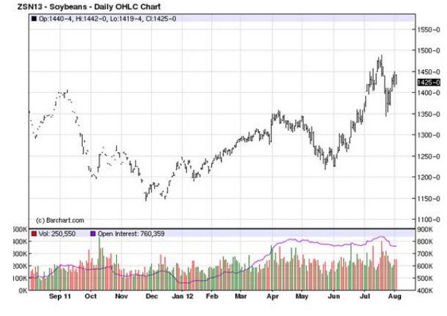 En el siguiente gráfico se observa la tendencia reciente de precios de la soja julio en Chicago, posición sobre la que se calcula el valor FOB de la soja argentina de mayo 2013: