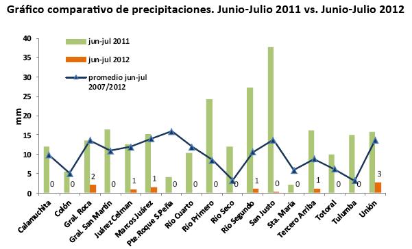 Según la Bolsa de Cereales de Córdoba prácticamente no hubo registros de precipitaciones en los meses de junio-julio del corriente año en la provincia con la finalización de la siembra de los cultivos invernales. En gran parte de la provincia de Córdoba (norte y centro), los perfiles presentan escasa reserva de agua útil en el suelo, mientras que al este, la reserva se encuentra entre el 10 y el 30%.