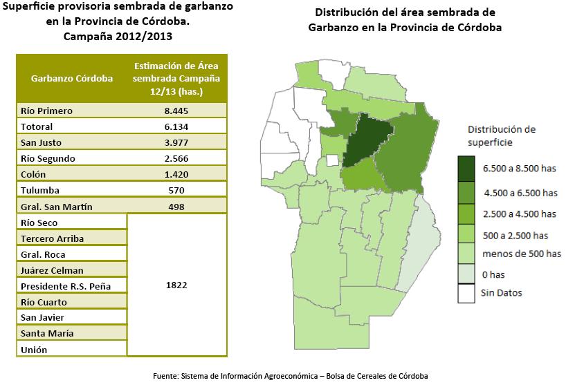 En cuanto a el cultivo de garbanzo, se han sembrado 25.432 has. en la provincia de Córdoba, ampliándose esta superficie en un 19% respecto del año anterior (campaña 2011/2012).