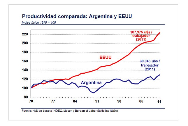 Para comparar los niveles, hemos hecho una estimación para 2011 y resultó que el trabajador medio produce valor agregado por 108.000 dólares por año en EE. UU. y en Argentina por 30.000 dólares. En este año, la comparación calculada al dólar oficial abulta bastante el valor agregado en dólares del trabajador argentino. Aun así es casi 4 veces menor que el estadounidense. Por eso es que un trabajador allá, cumpliendo las mismas horas que acá y teniendo los mismos conocimientos y experiencias, gana alrededor de 4 o 5 veces más que acá. En EE.UU. la gente es cara y las cosas son baratas y aquí las cosas son caras y la gente es barata. ¿Se entiende ahora qué es la productividad? Por esto es importante que pongamos el foco en la productividad y en su crecimiento de largo plazo. De nada sirve que aumente 4 o 5 años si después, a causa de las crisis, se desploma a los mismos niveles anteriores.