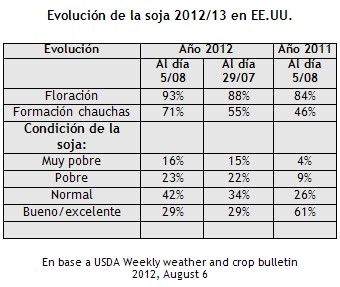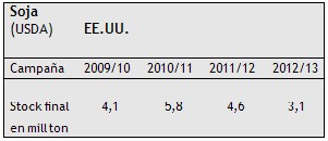 El organismo ha estimado que la producción soja estadounidense, 2012/13, se reduciría 10 millones de toneladas. Quedaría, por el momento, en un volumen de 73,30 millones (83,0 mes anterior; y 83,2 año anterior).