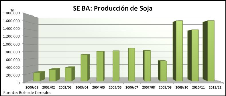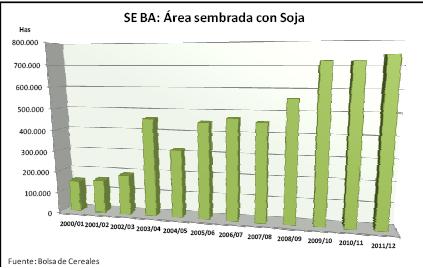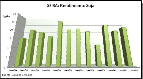 En cuanto a la cosecha gruesa 2011/12, el área implantada de soja durante dicha campaña registró un leve incremento de +3,5% en comparación al ciclo previo y alcanzó un nuevo récord de superficie luego de sembrarse 740.000 hectáreas. La recolección de la oleaginosa alcanzó 22,4 qq/ha al cierre de la campaña 2011/12.