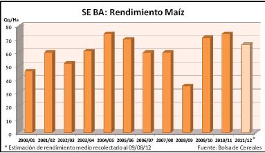 El rinde medio regional, luego de recolectarse un 96% de la superficie apta, se estimaba en 66 qq/ha. Dicha productividad refleja una merma interanual de -10,8% como consecuencia al período de déficit hídrico (enero y febrero 2012 principalmente), seguido por excesos en lotes bajos y heladas tempranas. Pese a ello, el actual rinde medio supera en un 9,7% a la productividad media de 60,2 qq/ha de las últimas once campañas.