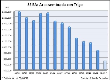 En cuanto al trigo, el área destinada a la siembra registró una constante y paulatina reducción durante las últimas ocho campañas. El área tentativamente implantada al presente ciclo equivale al 48% de la mayor superficie sembrada durante las últimas trece campañas (1,6 MHas, 2000/01).