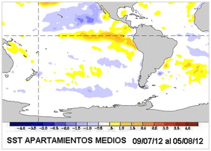 Si bien este indicador está en plena etapa de desarrollo, recién comenzando a salir de la neutralidad, las estimaciones de temperaturas obtenidas a través de imágenes satelitales promediadas por semana, permiten reconocer una continuidad en estos tenues desvíos positivos. Con prudencia, se puede argumentar que la situación deriva hacia lo que marcan los modelos, es decir, la instalación de un evento El Niño de intensidad débil durante la primavera y el principio del verano del hemisferio sur. Si el mismo gana en intensidad sería benéfico a la hora de garantizar precipitaciones con cierta holgura. Remarcamos que las recientes lluvias observadas en BA y LP, por sectores muy abundantes para el mes de agosto, no pueden atribuirse a las primeras fases del desarrollo de este episodio cálido.