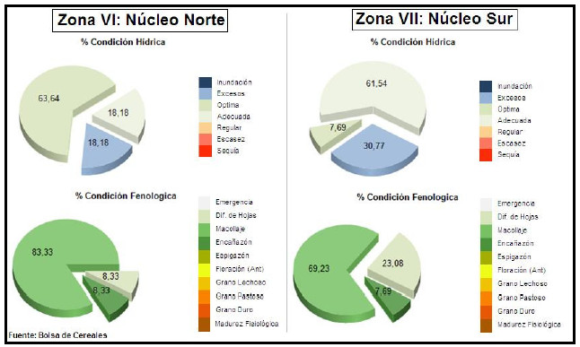 Por otra parte, la recuperación no sólo fue significativa y generalizada, sino que también fue oportuna para la franja central, en donde la mayoría de los cuadros implantados comienzan a transitar el período de encañazón. Actualmente estas regiones revertieron su déficit hídrico y, a poco tiempo de iniciar fases reproductivas críticas en la formación del rinde potencial, no presentan limitación alguna. Diferente es la situación en Chaco, en donde muchos cuadros se encontraban en muy mala condición antes de las precipitaciones relevadas, y debido a ello fueron pastoreados durante las últimas semanas.