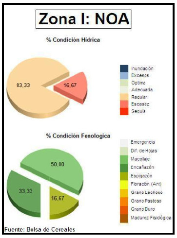 La recuperación hídrica relevada sobre gran parte del margen este del área agrícola nacional, comienza a verse reflejada en una mejor condición de los cuadros. Esto último es más notable en las regiones que hasta inicios de agosto mantenían una ajustada oferta hídrica, como son el NEA, Centro-Norte de Santa Fe, Núcleo Norte y Sur y en gran parte de La Pampa. A pesar de ello, sectores de Córdoba y la mayor parte de la región NOA, no han logrado revertir un continuo desabastecimiento hídrico que podría restringir el potencial de rinde a cosecha. Puntualmente una importante proporción de los cuadros implantados sobre la región NOA transita etapas críticas bajo una condición hídrica que varía entre regular y escasez.