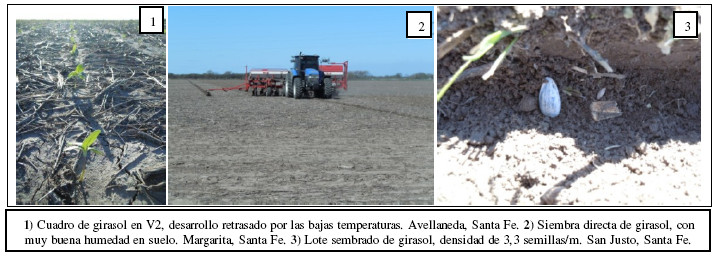 No obstante, para estas regiones restan más de dos semanas de ventana de siembra. Las bajas temperaturas de agosto ocasionaron demoras en el normal crecimiento de los plantíos. Hacia los núcleos girasoleros del sur bonaerense y pampeano, se mantiene una intención de siembra por encima del área implantada durante la campaña previa.