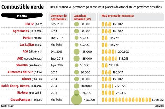 Al menos cinco de esos proyectos están en una etapa avanzada. Uno de ellos es Bio4, en Río Cuarto (Córdoba), que fue el primero en obtener un cupo para proveer 50.000 metros cúbicos de etanol por año al mercado interno. Esta empresa fue creada por 24 productores de maíz que invirtieron US$ 28 millones, y será la primera, en septiembre próximo, en colocar este biocombustible en la plaza local.