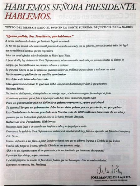 Es útil recordar que en la jornada de ayer, el primer mandatario provincial se reunió en Buenos Aires con Hernán Lorenzino (ministro de Economía de la Nación) y Diego Bossio (Director Ejecutivo de la ANSeS); en lo que fue la conciliación a la que convocó la Corte Suprema por la deuda que mantiene ANSeS con la Caja de Jubilaciones, Pensiones y Retiros de Córdoba (http://prensa.cba.gov.ar/politica/carta-del-gobernador-de-la-sota-al-jefe-de-gabinete-abal-medina/)