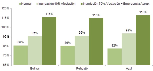 Si se considera el modelo de Pehuajó, con una disminución de producción de 40% en los cultivos de fina, las simulaciones indican una caída superior al 80% de los resultados económicos. La presión impositiva sobre éstos pasa del 86% al 96% en el campo con el 40% anegado y al 115% en campos con 70% inundado, aun en el caso en que se apruebe la Emergencia Agropecuaria en el partido (gráfico 1).