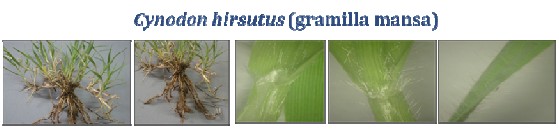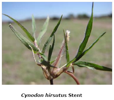 Cynodon hirsutus Stent, “gramínea mansa”, es una gramínea de ciclo primavero-estival, perenne y estolonífera. Entre los caracteres que la diferencian de Cynodon dactylon “gramón” se pueden citar su abundante pilosidad en las láminas y la ausencia de rizomas (Parodi, 1959).
