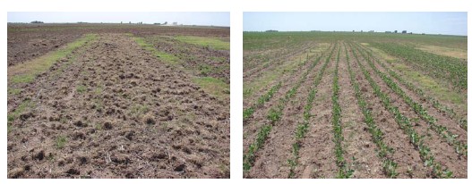 Parcela con alta infestación de Cynodon hirsutus a los 26 días de utilizado el cultivador de campo (izquierda, Foto 01/12/2011) y luego de dos labranzas con el mismo implemento (derecha, Foto 04/01/12).
