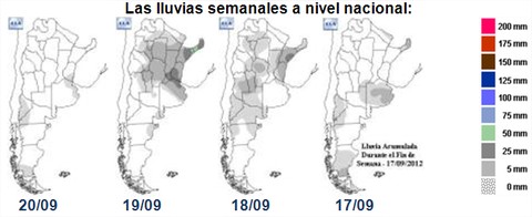 La semana se presentó con precipitaciones dispares, el acumulado más importante se desarrolló sobre la provincia de Buenos Aires, en la localidad de Ramallo, con un registro de 68 mm, seguido de Rosario, en la provincia de Santa Fe, con un acumulado semanal de 64 mm, mientras que sobre el noroeste de Buenos Aires y sur de Córdoba, las marcas pluviométricas fueron inferiores a los 5 mm, con un importante gradiente sudoeste-noreste. En cuanto a las marcas térmicas, éstas fueron muy variables a lo largo de la semana. Los valores máximos se mantuvieron muy homogéneos en toda la región entre los 30 y 33°C, siendo muy superiores a los de la semana pasada y también a los parámetros normales para el mes en curso.