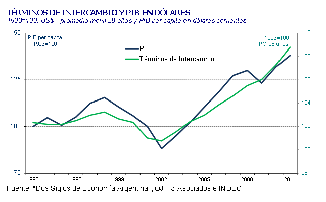 Vamos a analizar para la Argentina el casodel ciclo largo como Kondratieff -con un poco de temor por su experiencia- tratando de ver su impacto en la economía. Tomaremos el ciclo de nuestros términos del intercambio que tendría una duración de 28-30 años, aunque esta duración es aproximada, dado que combina los ciclos de los precios agrícolas con los ciclos de los precios industriales o de la energía, todos de distinta duración. Hemos calculado un promedio móvil de 28 años de los términos del intercambio para alisar las variaciones coyunturales y observamos que tiene mucha correlación con los ciclos del PIB del país. Esto significa que nuestro crecimiento depende bastante de cómo evolucionen los precios de los productos exportables.