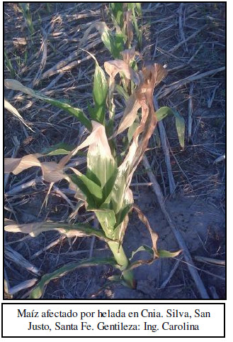 Lo siguen las zonas del Sur de Córdoba y Norte de La Pampa-Oeste de Buenos Aires, en donde los últimos días se puede apreciar un gran movimiento de máquinas realizando tareas de implantación. Se espera que se extiendan las siembras durante el mes de octubre hacia el resto de las zonas del área agrícola. Por otra parte, lotes implantados en fechas tempranas que actulamente transitan estadíos de diferenciación de hojas (V2-V4) tanto en las zonas del Centro-Norte santafecino como así también el el Centro-Este de Entre Ríos y la zona núcleo norte, han sido afectados por las heladas registradas durante la semana pasada, notándose un amarillamiento en las hojas.