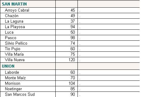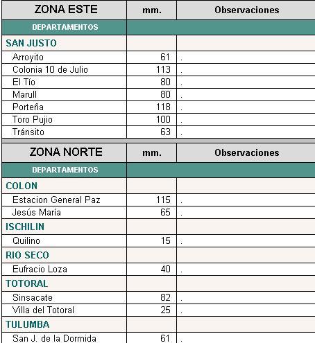 Según el informe del Sistema de Información Agroeconómica de la Bolsa de Cereales de Córdoba estos son los registros pluviométricos de la Provincia de Córdoba relevados en las localidades índices.