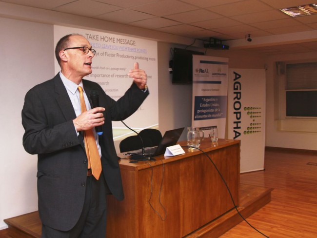 Goldsmith expuso su idea sobre “la productividad de factores”, un concepto económico de la relación entre los insumos y los productos, que se refiere a la cantidad de insumos que son necesarios para producir. El profesor aseguró que “El futuro de nutrir el nueve billón de personas en el año 2050 requiere sacar más producto de menos insumos, con inversión y tecnología. El sector agropecuario argentino debería producir esas tecnologías en vez de importarlas”.