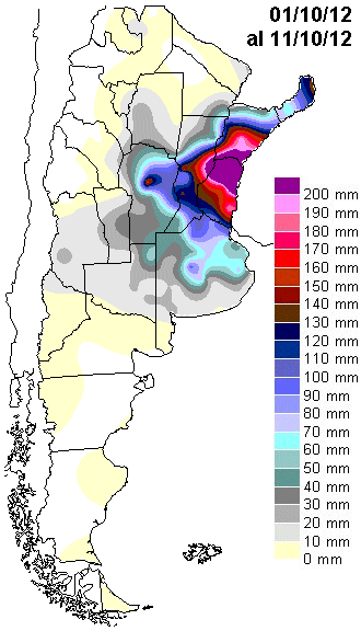 En el mapa se representan las lluvias acumuladas en los primeros diez días del mes. Se aprecia una extendida zona donde el piso de las precipitaciones es del orden de los 60 milímetros. Desde esta marca, los registros crecen de manera inusual hacia el este noreste de la región pampeana. En muchos sectores, en el resumen pluvial de este último período húmedo se acumularon las lluvias normales del mes. Al desplazarnos hacia el norte, las lluvias ganan volumen y se aprecia con claridad una franja que contiene registros superiores a los 200 mm, con máximos significativos en el sur de La Paz e inusuales en el departamento Concordia sobre la provincia de ER.