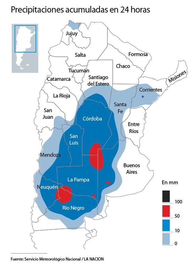 De la pampa húmeda, la más bendecida por las lluvias en los últimos días fue Córdoba. Lo fue por su cobertura. Según la Bolsa de Cereales de esa provincia, desde el jueves cayeron 20 milímetros en localidades como Luque (departamento de Río Segundo) hasta los 140 milímetros en Jovita (General Roca).