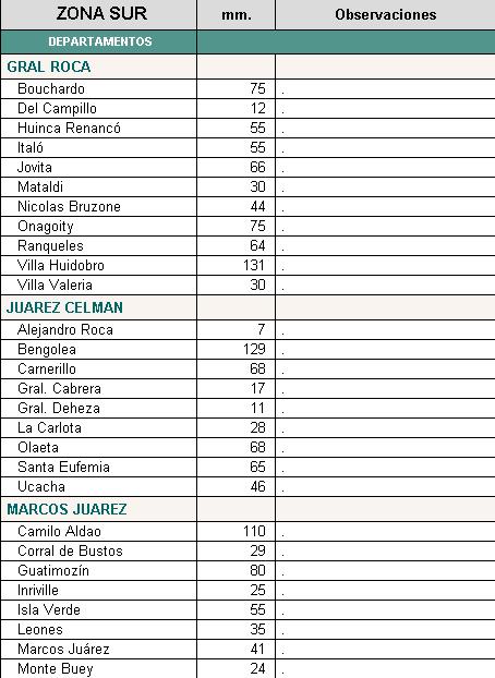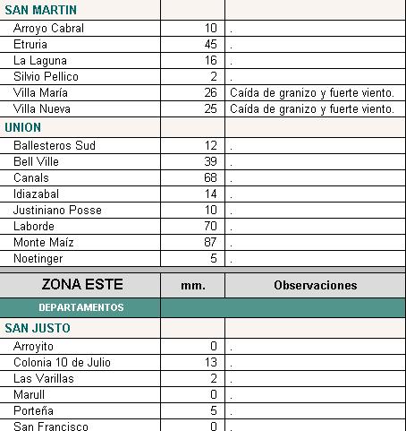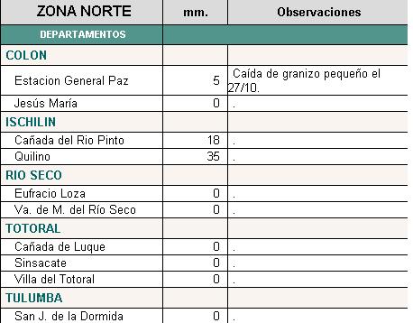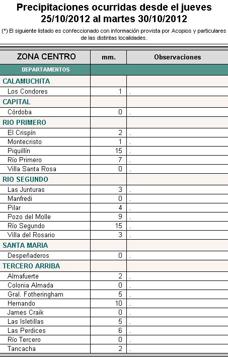 El Departamento de Información Agroeconómica de la Bolsa de Cereales de Córdoba releva un informe sobre los registros pluviométricos de la Provincia de Córdoba desde el jueves 25 al lunes 29 de octubre de 2012