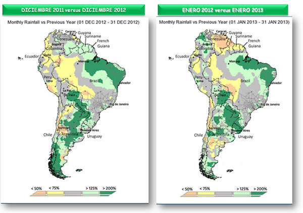 Importantes volúmenes de precipitaciones previas a la cosecha de soja 2012/13 sobre las áreas agrícolas de Uruguay, Paraguay y parte del sudeste del Brasil podrían complicar la calidad de la oleaginosa (granos verdes y exceso de humedad), mientras un porcentaje importante del área amazónica en Brasil podría experimentar una fase de restricciones hídricas.