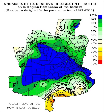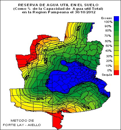 RESERVA DE AGUA ÚTIL EN EL SUELO (como % de la capacidad de agua útil total) en la Región Pampeana el 30 de Octubre de 2012