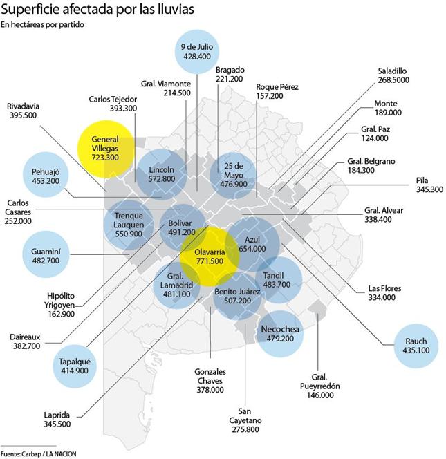 Al respecto, ayer, la Confederación de Asociaciones Rurales de Buenos Aires y La Pampa (Carbap) dio a conocer un relevamiento que ubica la superficie inundada en 13,5 millones de hectáreas. Se trata de dos veces más que la estimación oficial de la cartera provincial. Y lo hizo sobre la base de las actas reconocidas por la misma Comisión de Emergencia y Desastre Agropecuario bonaerense, en la que confluyen productores y autoridades públicas. Para los ruralistas, superficie afectada es incluso aquella donde no se puede hacer nada, ni siquiera tener un animal, algo que el gobierno provincial no toma como tal.