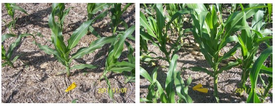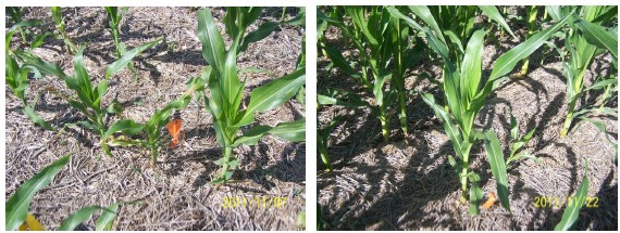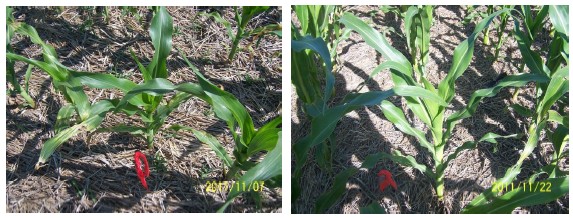 Ficha Naranja: corresponde a plantas que por causa del picado, presentan 2 a 3 hojas secas y enruladas en el extremo que obstaculizan la normal emergencia de las demás hojas. (Severidad 2)