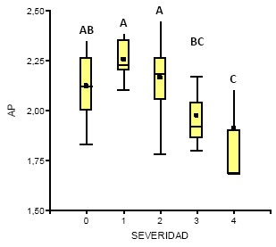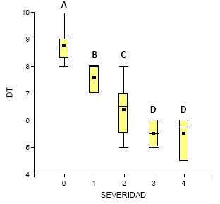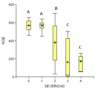 Los grados de severidad 0 y 1 no expresan diferencias significativas en cuanto al número de granos, pero si se observa significancia a medida que aumenta el grado de severidad.