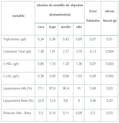 De la tabla 2 surge que el aumento de la proporción de SA en el suplemento (desde cero hasta alto, de 1,5 a 2,25 kg de SA) adicionan al rumen de 5,2 a 7,8% de grasa a la dieta (Balbuena et al 2000) eleva en forma lineal las concentraciones plasmáticas de triglicéridos, colesterol total, C-HDL, C-LDL y de las lipoproteínas, disminuyendo las lipoproteínas beta y relación alfa – beta lipoproteínas, cambios que se atribuyen al elevado tenor graso de dichas semillas.