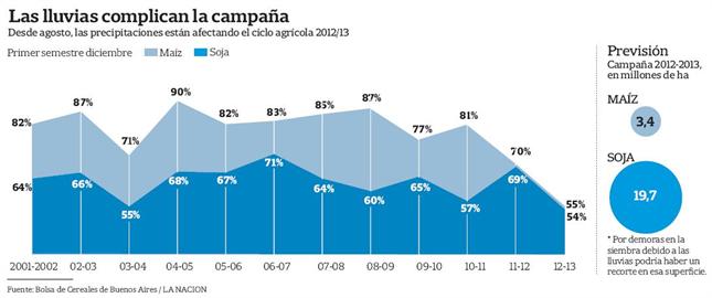 Para el maíz, quedan unas tres semanas y medias más para que se pueda completar la siembra. Y aquí aflora la incertidumbre. "Creo que va a ser menor el área final que los 3,4 millones de hectáreas de maíz comercial de que se habla. Hay serias dificultades para entrar a muchos campos del sur de Córdoba y el oeste de Buenos Aires", explicó el productor Santiago Del Solar.