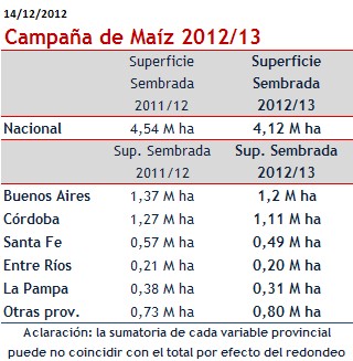 Con casi un 70% sembrado, la estimación del área maicera 2012/13 se ajusta a poco más de 4,1 millones de hectáreas, un 9,2% por debajo de la superficie del ciclo pasado. (Los datos de la campaña 2011/2012 fueron ajustados con información aportada por imágenes satelitales sobre la región núcleo, llevando el área sembrada en aquel entonces a 4,54 millones de hectáreas.)
