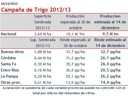 Hay una fuerte disminución en la cifra de producción de trigo, respecto del informe precedente, al recortar el rinde de 29,5 qq/ha a 27,4 qq/ha como promedio nacional. Teniendo en cuenta que se parte de una superficie sembrada de 3,6 millones de hectáreas y de un área sin cosechar de 140 mil hectáreas, la producción 2012/2013 resultaría en 9,5 millones de toneladas de trigo.