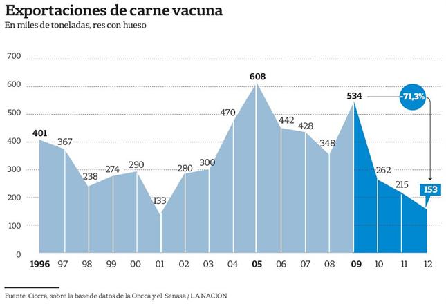 Según la entidad, el registro de los primeros 10 meses de 2012 se encuentra un 74,8% por debajo de igual período de 2005, el año en que la Argentina tuvo las exportaciones más altas desde fines de los años 70. En rigor, en enero/octubre de 2005 se vendieron 608.000 toneladas equivalentes res con hueso, una cifra muy superior a las 153.136 toneladas de enero/octubre de 2012.