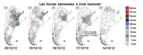 Empezaron el domingo 15/12 con violentas tormentas acompañadas de granizo que dejaron 60.000 has afectadas al sur de Marcos Juárez. Las tormentas se sucedieron día tras día, y terminaron el jueves con un inédito evento pluvial con centro en Rosario y 173 mm caídos en 24 horas. En la semana la región recibió entre 50 y 315 mm. La zona más afectada fué el sudeste de Santa Fe.