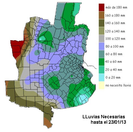 Observando el mapa puede interpretarse que la necesidad hídrica no es la misma en toda la región pampeana. Gran parte de la zona núcleo demanda precipitaciones del orden de los 80 milímetros antes del 23 de enero para mantener las reservas en un nivel satisfactorio. Si a esta estimación la cruzamos con el pronóstico de corto plazo, podremos concluir que estamos ante diez días que pueden considerarse cruciales para la campaña y que pondrán mucha presión sobre el comienzo de la última década de enero.