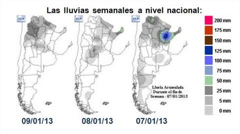 Hubo precipitaciones aisladas y temperaturas muy elevadas, esto último sobre todo en los departamentos cordobeses (el máximo estuvo en Pozo del Molle, que midió 38,7° C). Las lluvias acumuladas más importantes estuvieron en el sector central de la provincia de Córdoba, destacándose los registros de Idiazabal (Córdoba) con 57,6 mm a lo largo de toda la semana. En el resto de la región núcleo los acumulados variaron entre 5 y 25 mm. En cuanto a las áreas afectadas por granizo, San Eugenio, Carabelas y San Antonio de Areco pasaron a engrosar la lista de localidades que sufrieron los embates del fenómeno en víspera de Nochebuena.