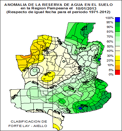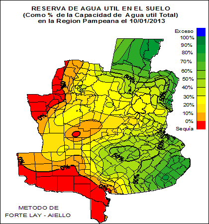 RESERVA DE AGUA ÚTIL EN EL SUELO (como % de la capacidad de agua útil total) en la Región Pampeana el 10 de Enero de 2013