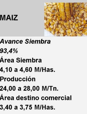 El área de siembra del cereal con destino a grano comercial está proyectada para esta campaña de 3,4 M/Has. a 3,75 M/Has. con una producción estimada entre los 24 a 28 M/Tns.