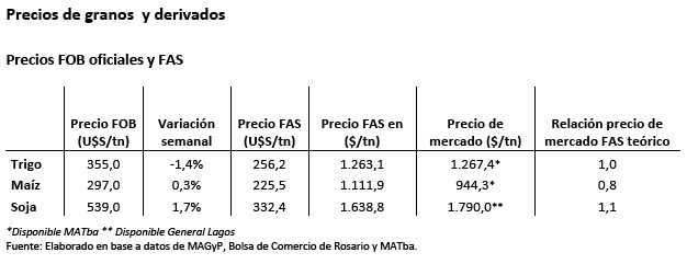 La cotización del trigo cayó nuevamente, y fue U$S 5 menor, es decir, un 1,4% más baja en relación a la de la semana pasada. El precio FOB del maíz experimentó una leve suba de U$S 1, mientras que el precio de la soja fue el más beneficiado con un incremento del 1,7% (+U$S 9). Comparando el precio de mercado con el precio FAS teórico, en el caso del maíz y el trigo, el productor recibe el 80% y el 100% respectivamente. Por su parte, el precio de mercado de la oleaginosa excede su valor de paridad en un 10%.