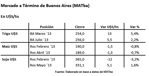 Los precios futuros en el Mercado a Término de Buenos Aires se movieron de diferente manera respecto al Mercado de Chicago. La posición Marzo 2013 para trigo subió U$S 13, con una cotización de U$S 254 por tonelada. Los contratos para el maíz se negociaron a un precio menor que los de la semana pasada, con una cotización 0,8% más baja. El precios de la oleaginosa perdió U$S 12 en la posición Febrero 2013, mientras que en la posición Mayo 2013 ganó U$S 5,1.