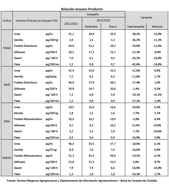 La caída en la relación puede deberse a un incremento en el precio del cultivo, una caída en el precio de los insumo s, o una combinación de ambos, lo contrario para un incremento en la relación. Por ejemplo, en el caso del sorgo, en la campaña 2011/2012 se requerían 8,9 quintales para comprar 25 kg de semilla, mientras que en la campaña actual esa relación disminuyó a 7,5 quintales, lo cual fue producido por un aumento del precio del cereal ya que el precio de la semilla no experimentó variaciones.